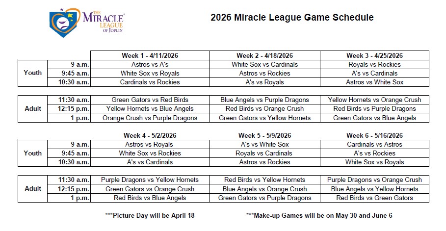 The 2026 Spring Season will begin on April 11, with no games played on Memorial Day weekend. All games will be played on Saturday mornings at the Will Norton Miracle Field located at the Joplin Athletic Complex. The Will Norton Miracle Field is fully accessible for individuals with any type of disability and is located next to a fully accessible playground. There are no team practices during the week.